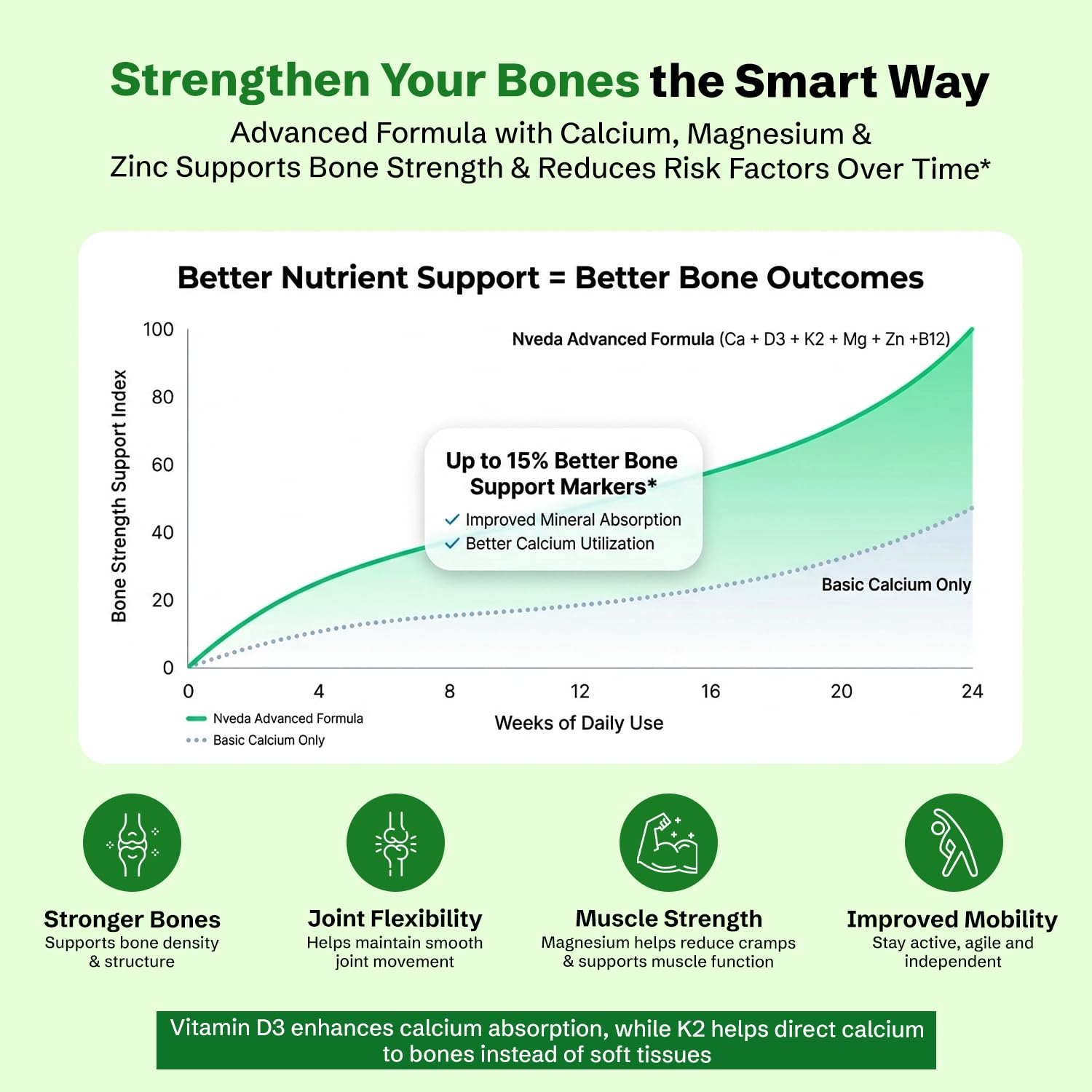 Nveda Calcium 1000mg with Vitamin D3, Magnesium, Zinc, Vitamin K2 & B12 is a comprehensive bone health formula. Each tablet provides 1000mg Calcium Citrate (highly bioavailable form) along with synergistic nutrients including Vitamin D3, Magnesium, Zinc, Vitamin K2 MK7, and Vitamin B12. This advanced combination supports calcium absorption, directs calcium to bones, strengthens bones and joints, and boosts overall immunity for men and women.