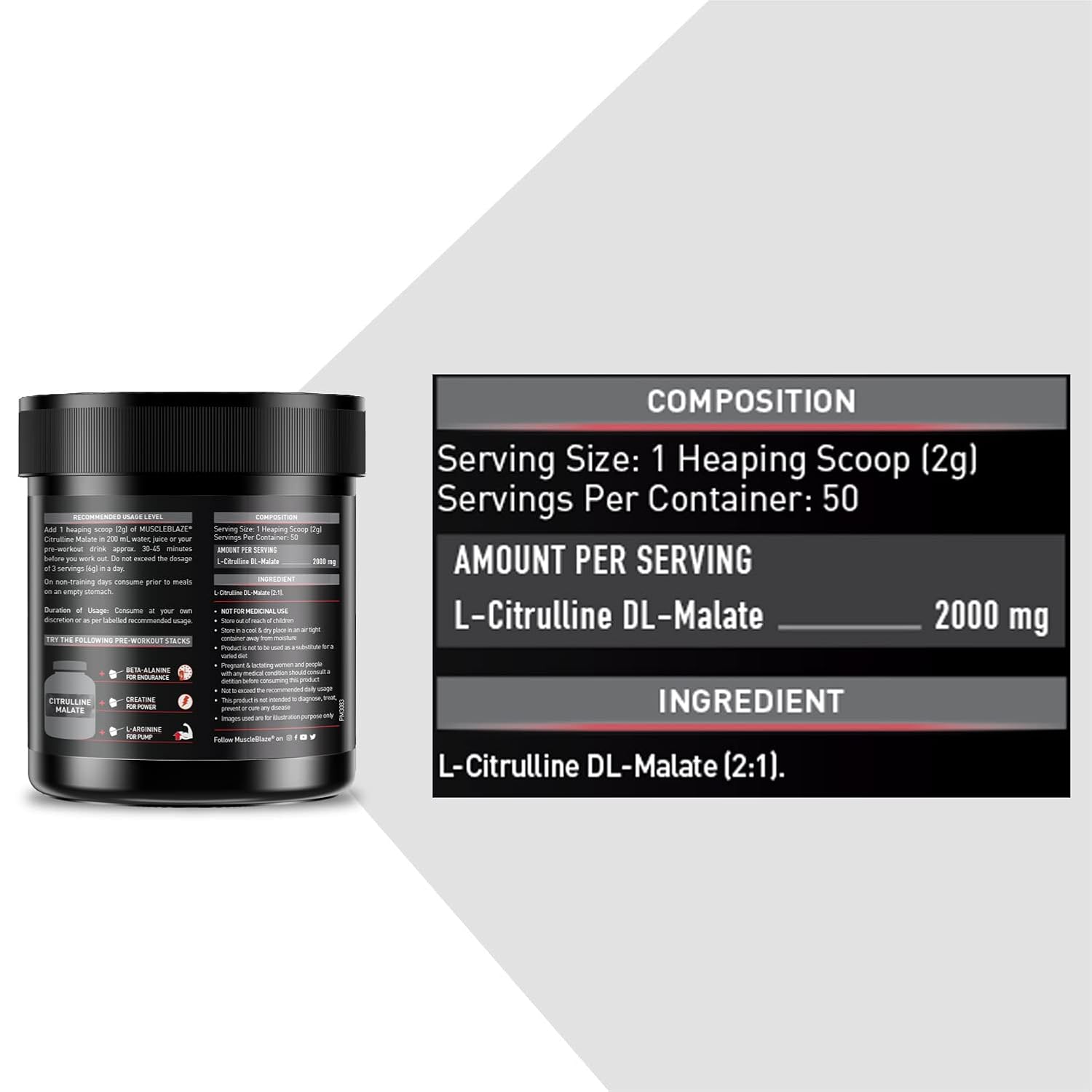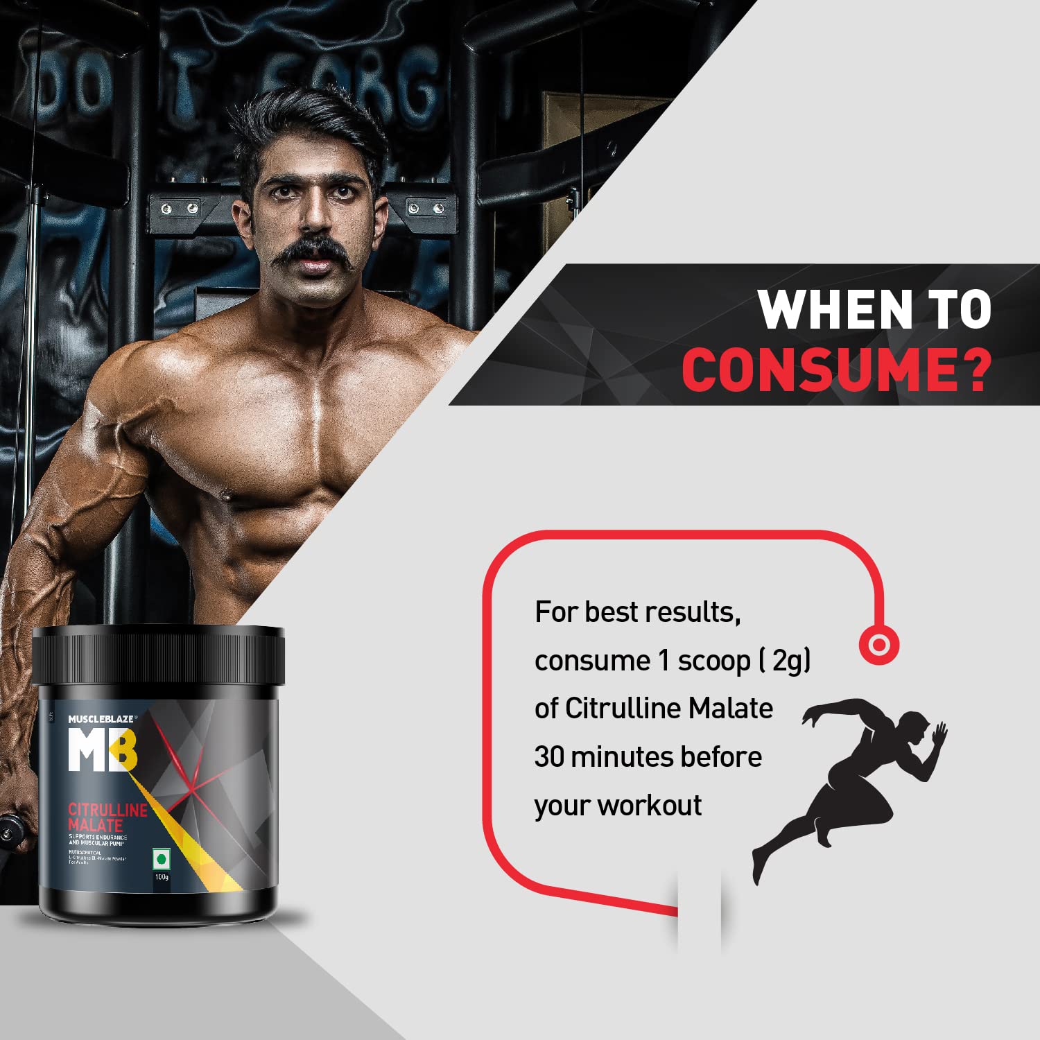 MuscleBlaze Citrulline Malate Powder delivers 2g of Citrulline Malate per serving. This advanced formula is designed for improved endurance and muscle pump, supporting increased blood flow and reducing fatigue. It is suitable for athletes and fitness enthusiasts looking to enhance their workout performance.