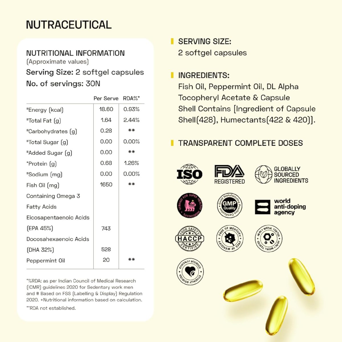 Other Ingredients: Gelatin Capsule, Glycerin, Purified Water, Natural Lemon Flavour (for no fishy burps), Antioxidants.